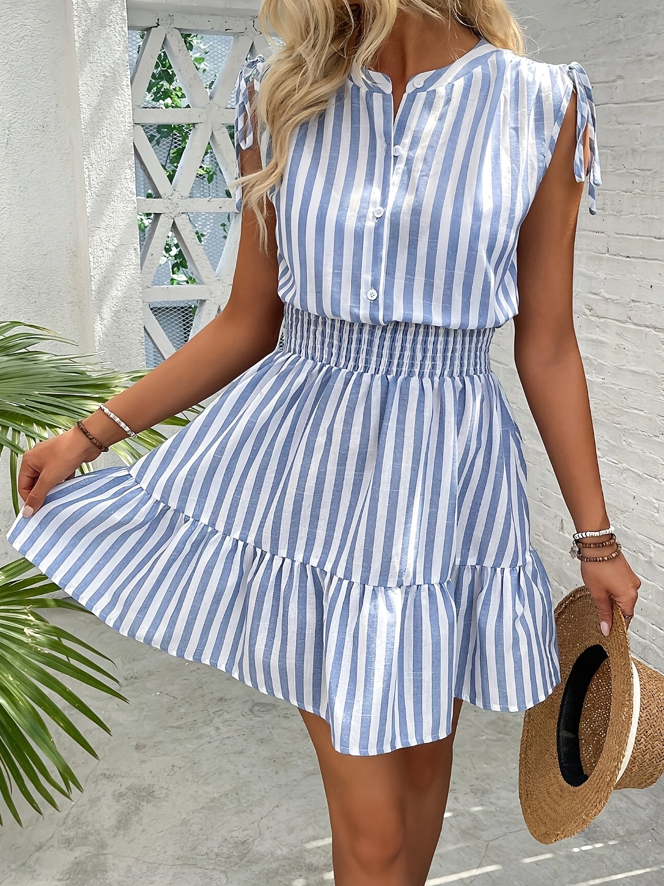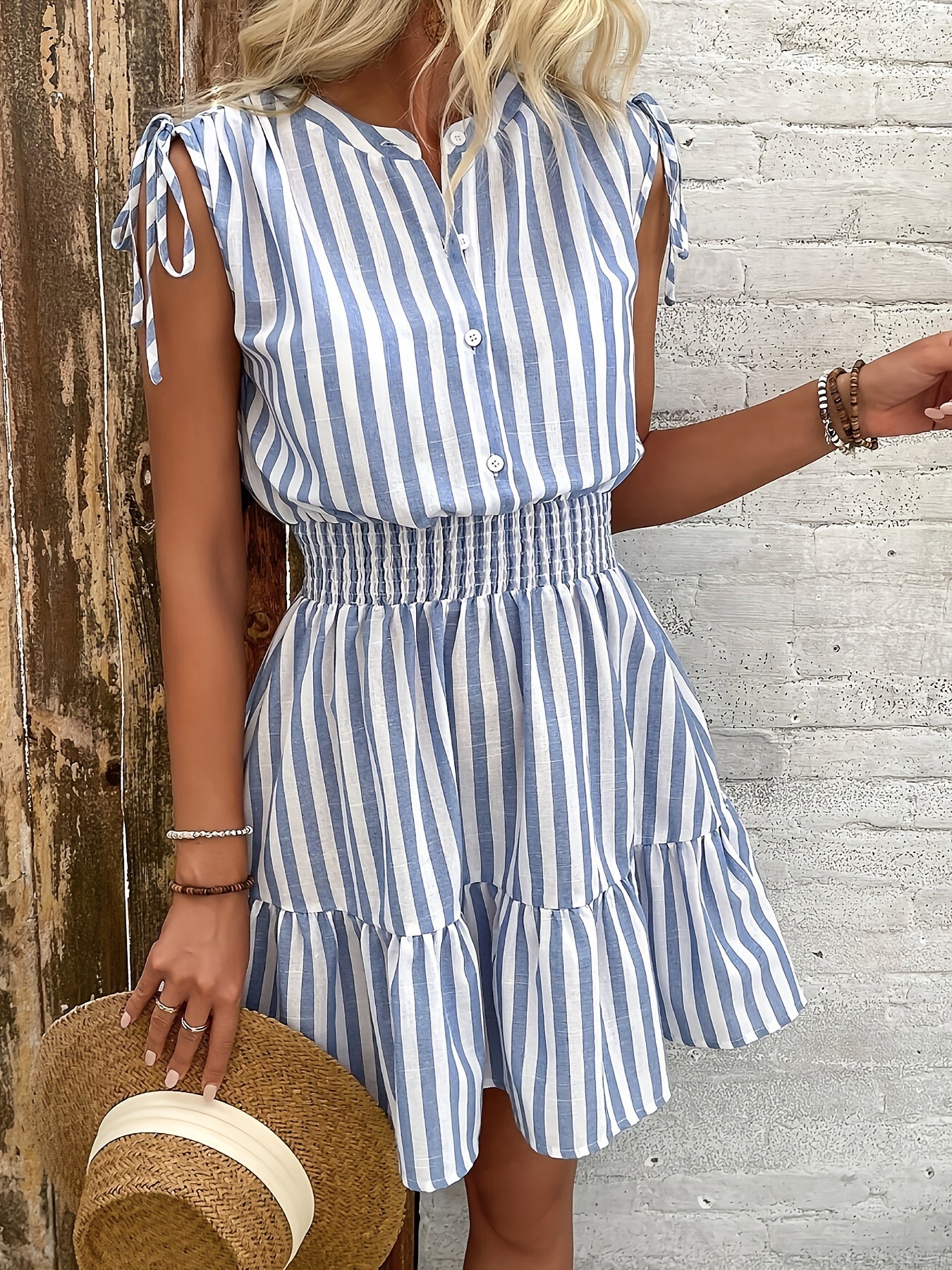 Emily ist eine einfach Und schmeichelhaft Ein Kleid, das die Essenz des Sommers einfängt. Die zarten blauen und weißen Streifen erzeugen einen frischer Ausdruck Während die Schleifendetails an den Schultern und die betonte Taille eine feminine Silhouette Die